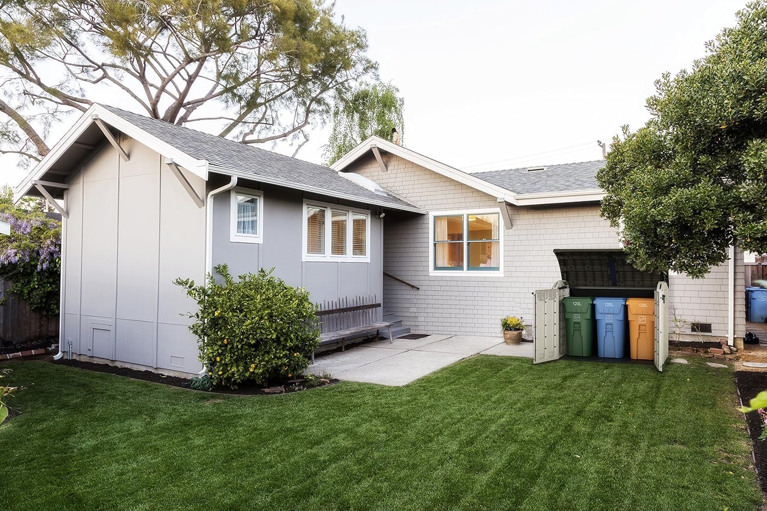 Met een lengte van 5,8 ft en breed openslaande dubbele deuren biedt deze opbergbox voldoende ruimte voor grote items zoals grasmaaiers, BBQ-apparatuur, zwembadaccessoires of zelfs twee grote afvalcontainers. Het versterkte deksel, het afsluitbare ontwerp en de weerbestendige constructie zorgen ervoor dat uw spullen het hele jaar door veilig en in perfecte staat blijven.